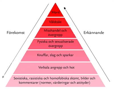 Våldet påverkas av samhällsstrukturer och attityder, är kopplad till jämställdhet och diskriminering. Våldspyramiden visar hur mindre allvarliga företeelser utgör en grogrund och ett första steg till allvarligare våld. Vi kan alltså alla göra en skillnad! Kommunen sprider information och jobbar med att motverka stigma så att fler vågar att söka hjälp.