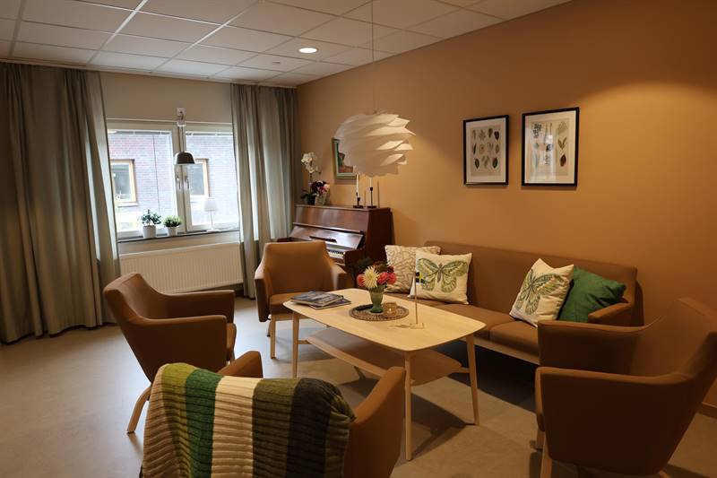 På Humlegården märks det att man har tänkt på detaljerna både för de boende och för personalen. Dementa behöver trygga, lättorienterade miljöer med tydliga visuella ledtrådar och välkända rutiner. Färgsättning och belysning spelar stor roll, där varma och lugnande färger kan minska stress och förvirring. De gemensamma ytorna som främjar socialt umgänge går därför i varma aprikos toner. Inne på rummen, där de boende alltid har möjlighet till lugn och ro är kök och väggar målade i ljusa grå toner.